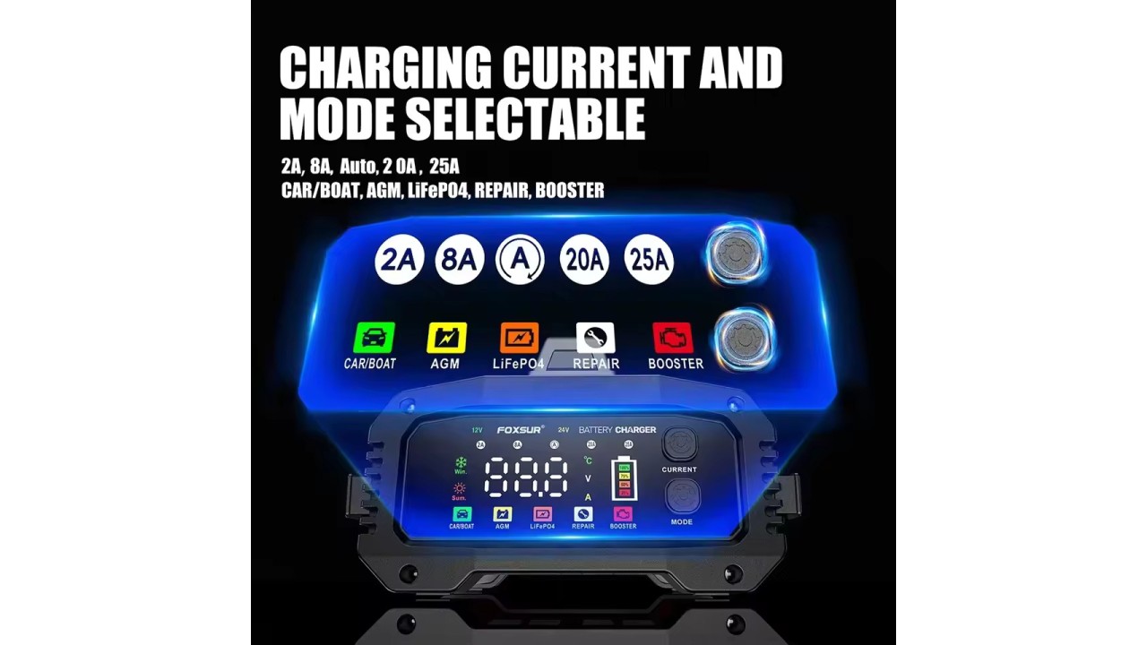 • 【5 επίπεδα ρεύματος φόρτισης με επιλογή】Ο φορτιστής υποστηρίζει επιλογή στο ρεύμα φόρτισης ανάλογα το μέγεθος της μπαταρίας που θέλετε να φορτίσετε. Η επολογή γίνεται χειροκίνητα ανάμεσα σε 5 επιλογές.  2Α, 8Α,  αυτόματη , 20Α και 25Α. Η σωστή επιλογή ρεύματος φορτίζει πιο σωστά την μπαταριά σας και σας γλιτώνει χρόνο φόρτισης ταυτόχρονα.