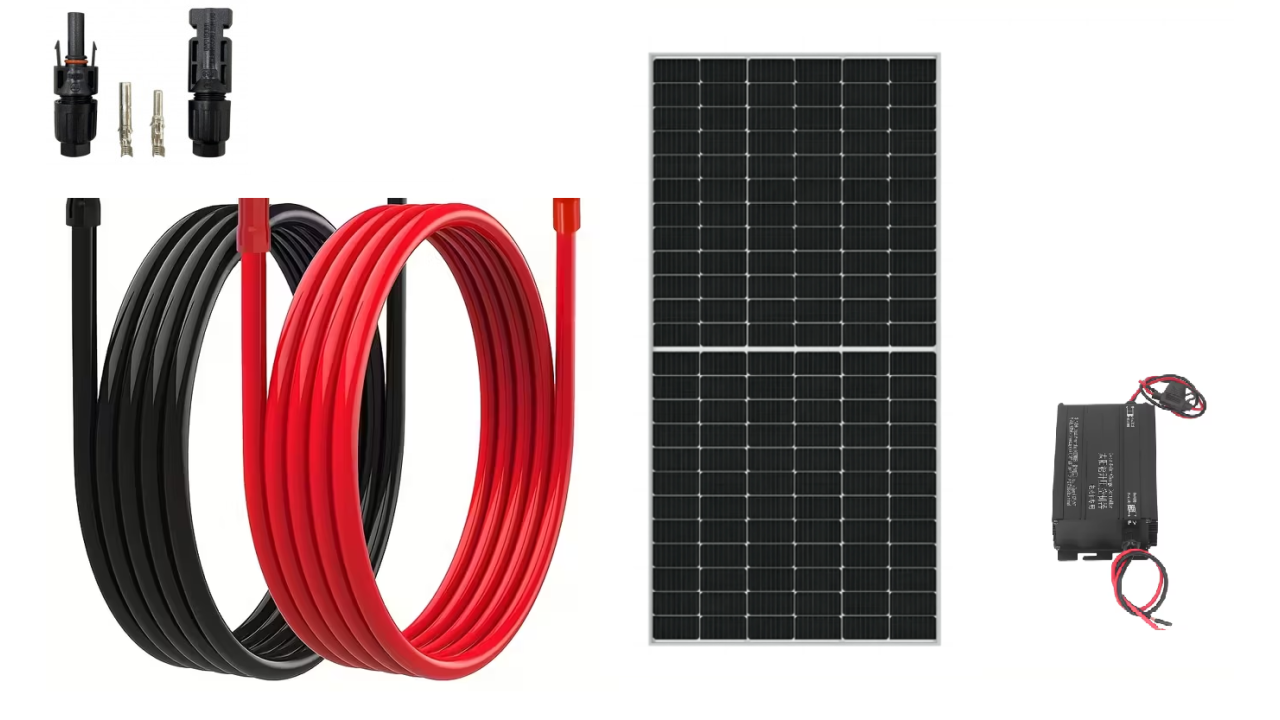 Το ΚΙΤ αποτελείται από ένα πάνελ διαστάσεων 176x113εκ. ισχύος 385W ή 450W , μία μονάδα ελέγχου , 1 ζευγάρι φις MC4 και 3 μέτρα ζευγάρι καλώδιο solar διατομής 6mm.