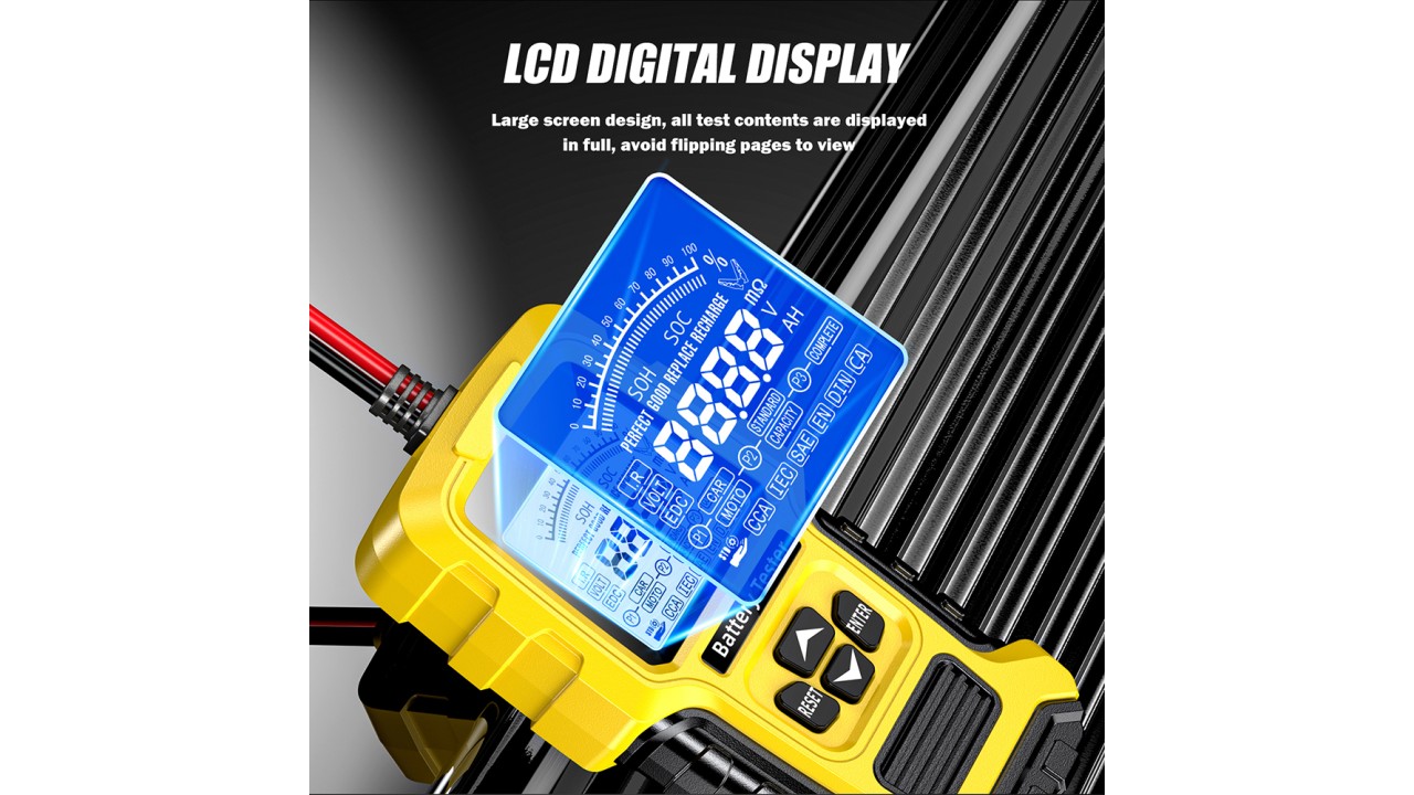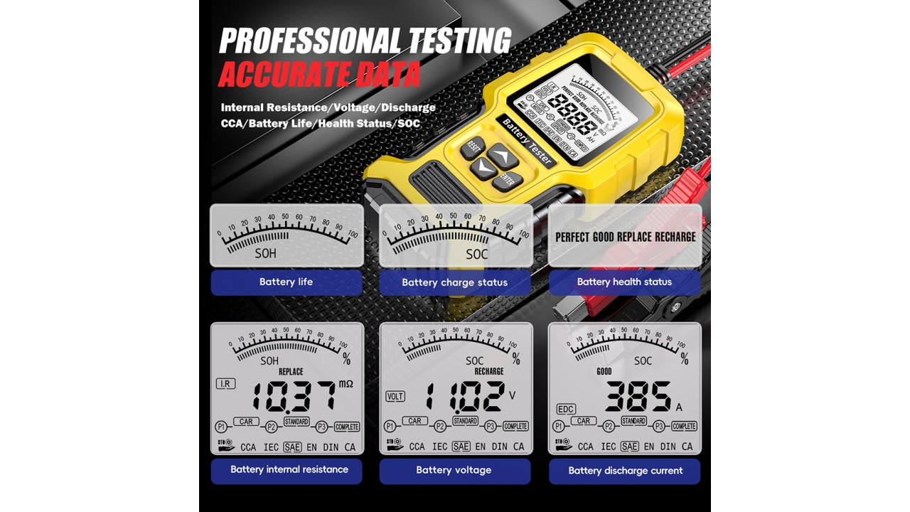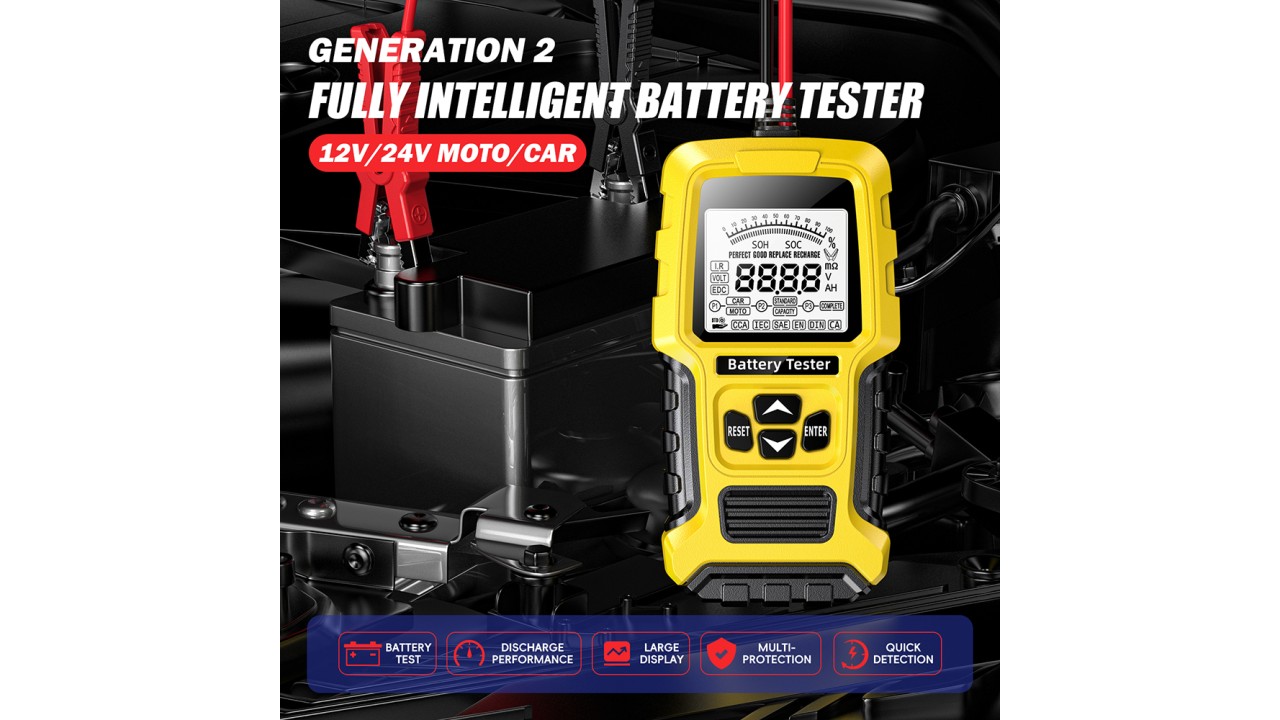 - Προσφέροντας τα πιο βασικά χαρακτηριστικά, αυτός ο ελεγκτής μπαταρίας μπορεί να εκτελέσει δοκιμές μπαταρίας, φόρτισης και εκκίνησης της μίζας σε όλους τους τύπους μπαταριών μολύβδου-οξέος 12V και 24V. Με αυτό το εργαλείο, οι χρήστες μπορούν να αναλύσουν τα συστήματα εκκίνησης και φόρτισης σε μια ευρεία γκάμα μπαταριών!